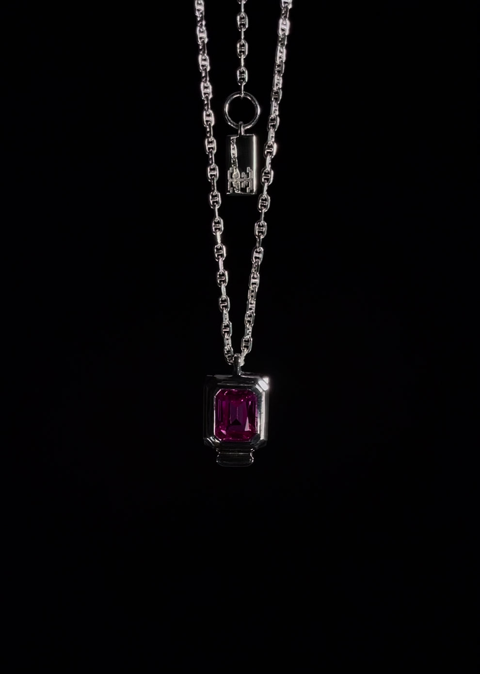 The "Escudo" necklace, meaning "Shield" in Spanish, is inspired by classic Baroque coat of arms but reimagined with a simple, angular design. Traditionally a symbol of power and familial representation, this piece is meant to serve as a personal reminder of strength for the wearer. I also incorporated negative space into the design, allowing the gemstone to be viewed from different angles - a subtle detail that reflects light and colour beautifully onto the wearer.