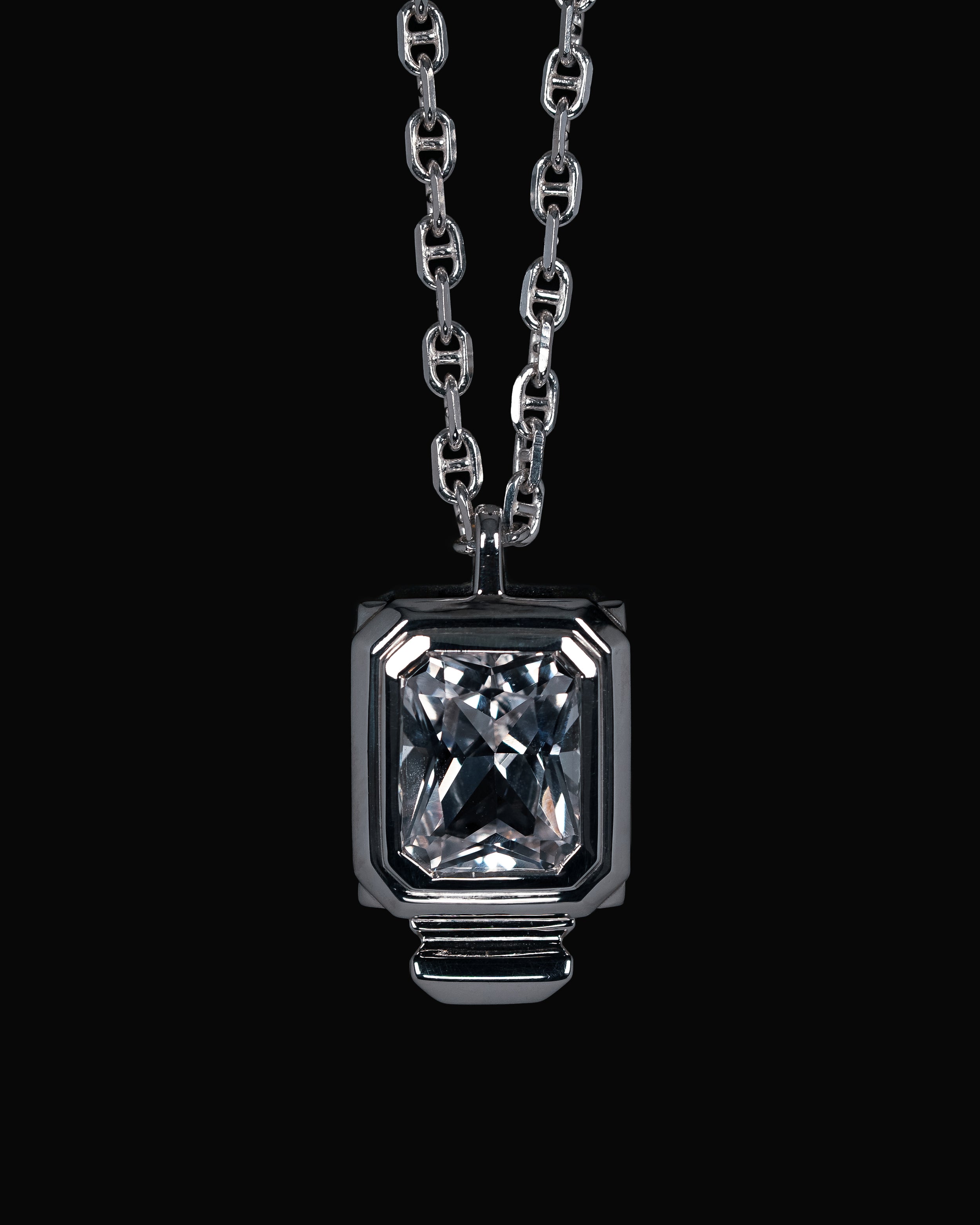 The "Escudo" necklace, meaning "Shield" in Spanish, is inspired by classic Baroque coat of arms but reimagined with a simple, angular design. Traditionally a symbol of power and familial representation, this piece is meant to serve as a personal reminder of strength for the wearer. I also incorporated negative space into the design, allowing the gemstone to be viewed from different angles - a subtle detail that reflects light and colour beautifully onto the wearer.